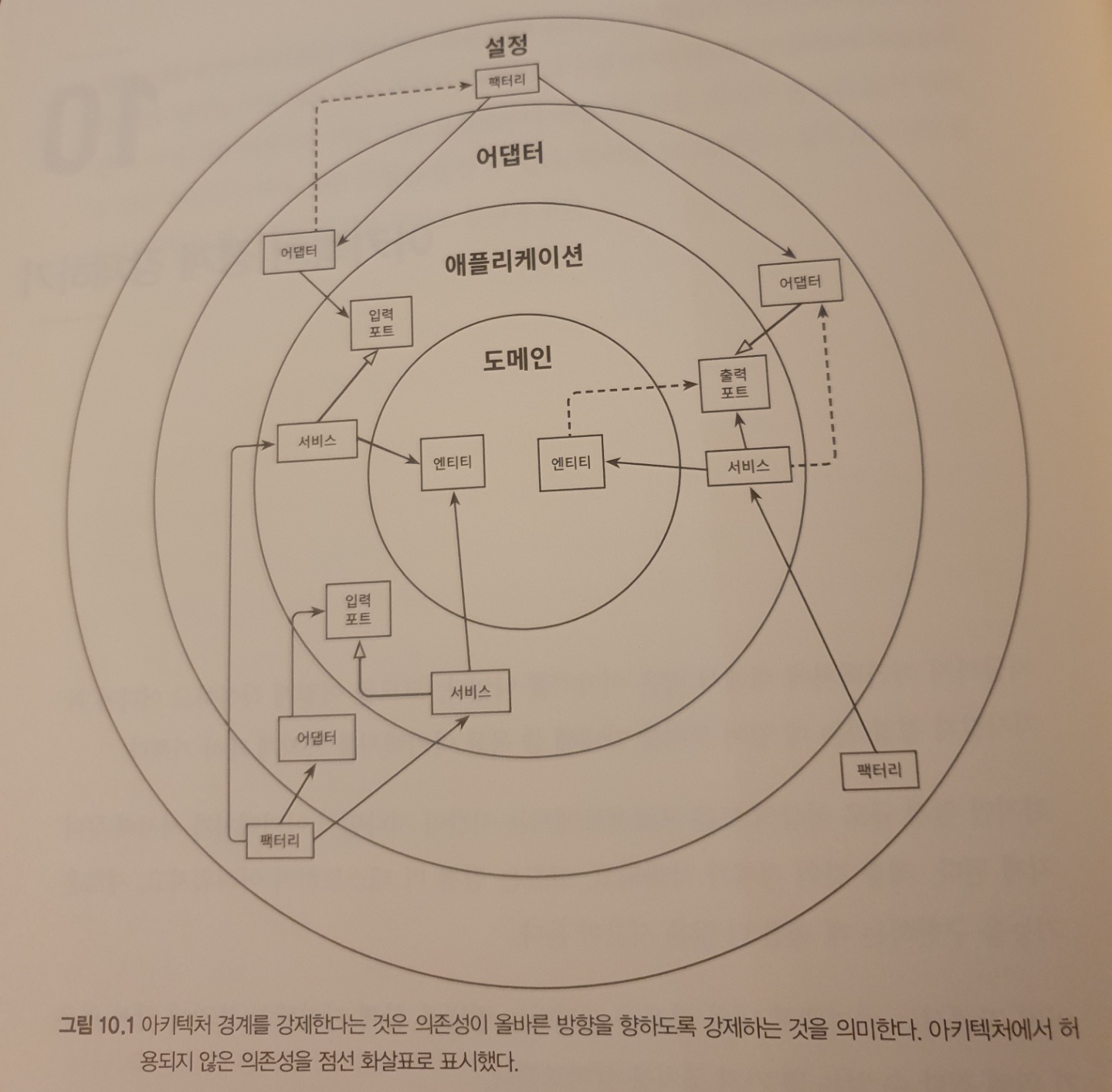 아키텍처의 경계는 명확하다. 각 계층 사이, 안쪽 인접 계층과 바깥쪽 인접 계층 사이에 경계가 있다.